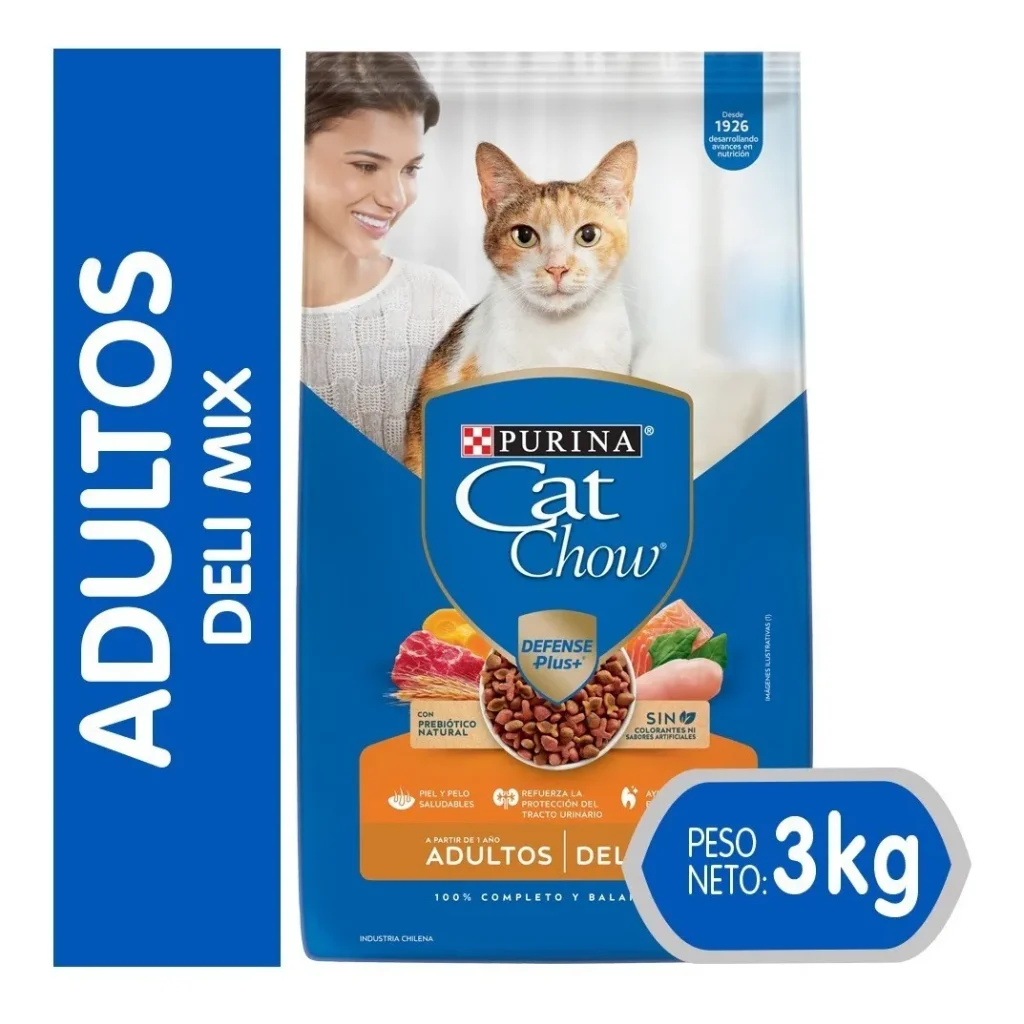 Alimento Seco Para Gato Cat Chow® Adulto Delimix 3kg es la opción ideal para gatos adultos de todos los tamaños. Este delicioso mix de salmón, carne y pollo no solo satisface el paladar de tu mascota, sino que también contribuye a su salud dental al ayudar a reducir el cúmulo de sarro.