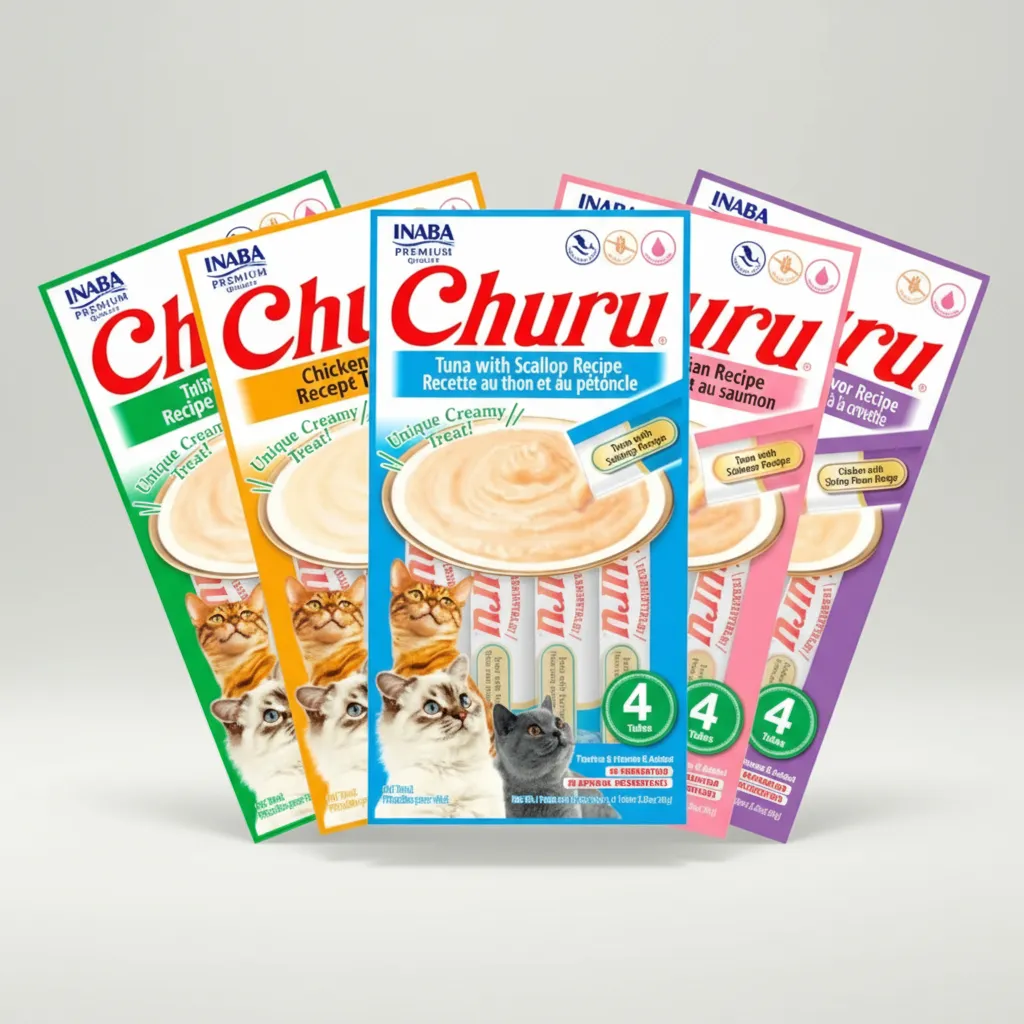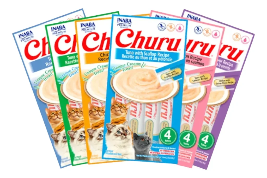 3 Paquetes De Churu Surtido En Sabor Segun Stock Disponible. Novedoso y delicioso snack para gatos de textura cremosa (puré) y alta palatabilidad. Tiene un alto contenido de humedad lo que encanta a los gatos y además contribuye a su hidratación. Cada paquete contiene 4 tubitos de 14 gr c/u (Total 56 gr).